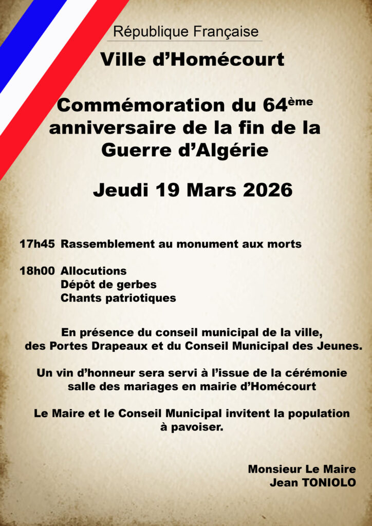 Commémoration du 64ème anniversaire de la fin de la guerre d’Algérie. précédent[MODIFICATION D’UNE ANTENNE RESEAUX A HOMECOURT]suivant[RÉSULTATS DES ÉLECTIONS MUNICIPALES]