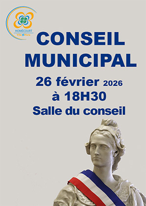 Vous êtes invité à la séance du Conseil municipal de la Commune de HOMECOURT, qui aura lieu le 26 février 2026 à 18h30 – Salle du Conseil Municipal.