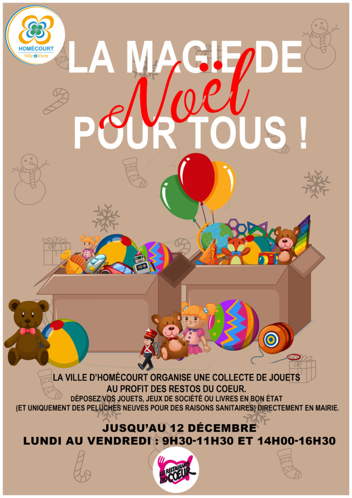 La ville d’Homécourt organise une collecte de jouets au profit de l’association locale Les Restos du Cœur de notre ville, pour apporter un peu de chaleur et de joie aux enfants en situation de précarité.